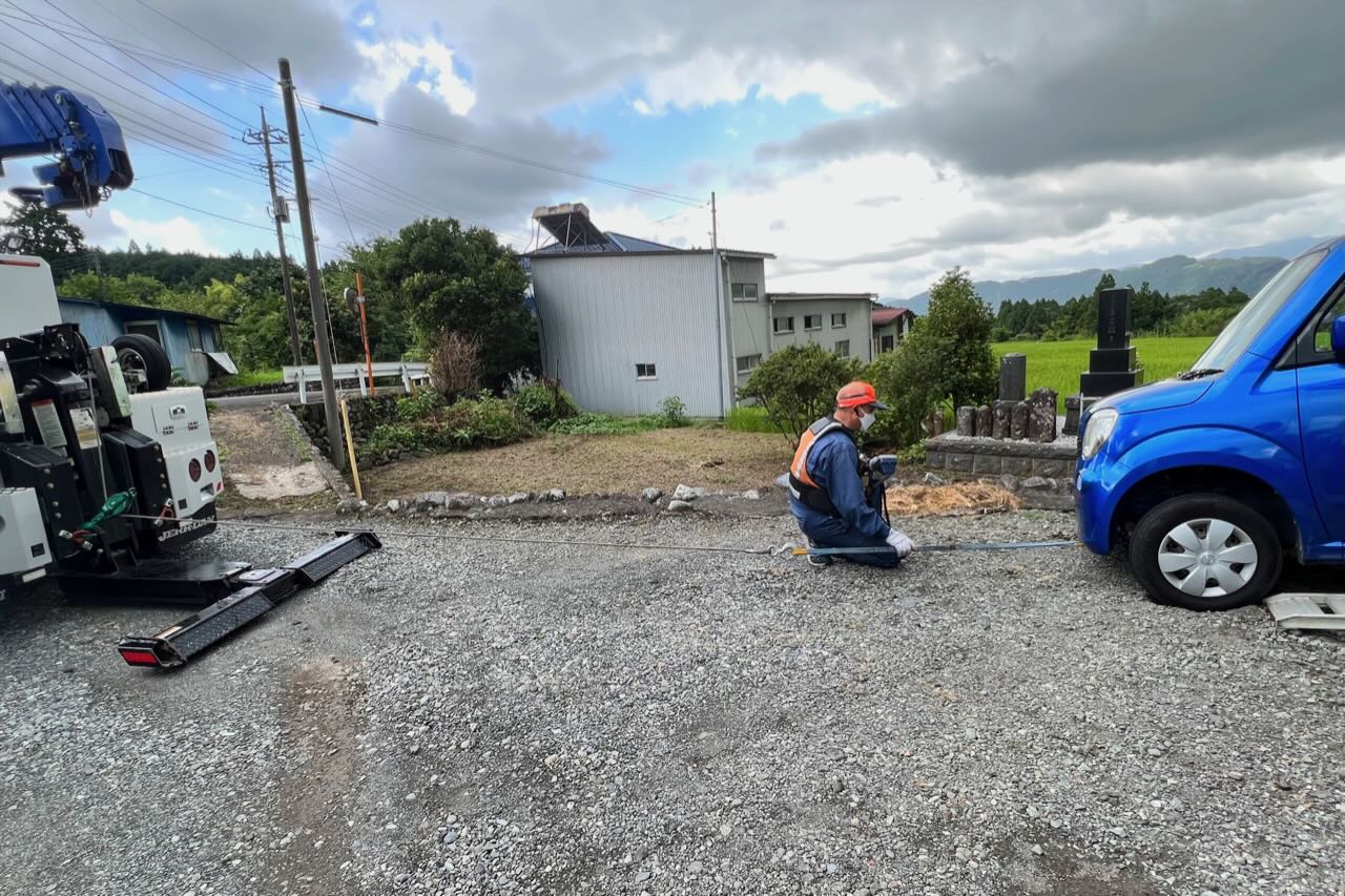JAFの人、カッコ良かったです。一人でテキパキとやっていきます。乗ってきた車からウインチを引っ張り出しています。