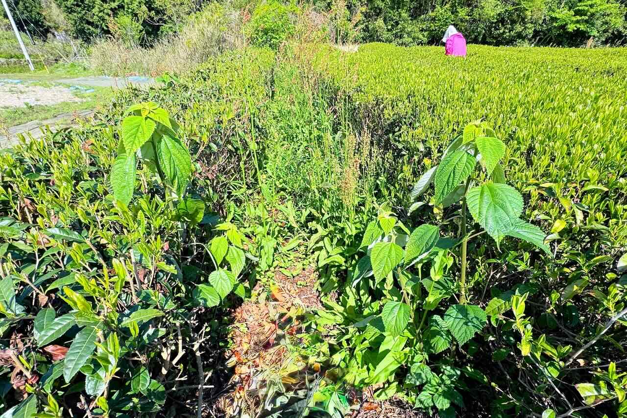 通路だけでなく、茶の木の下にも草が生えているので、手を伸ばして取っています。取らずに放っておくと、その草が伸びて、茶の木の上まで出てきたり、つる性の植物は茶葉や枝に巻き付きます。