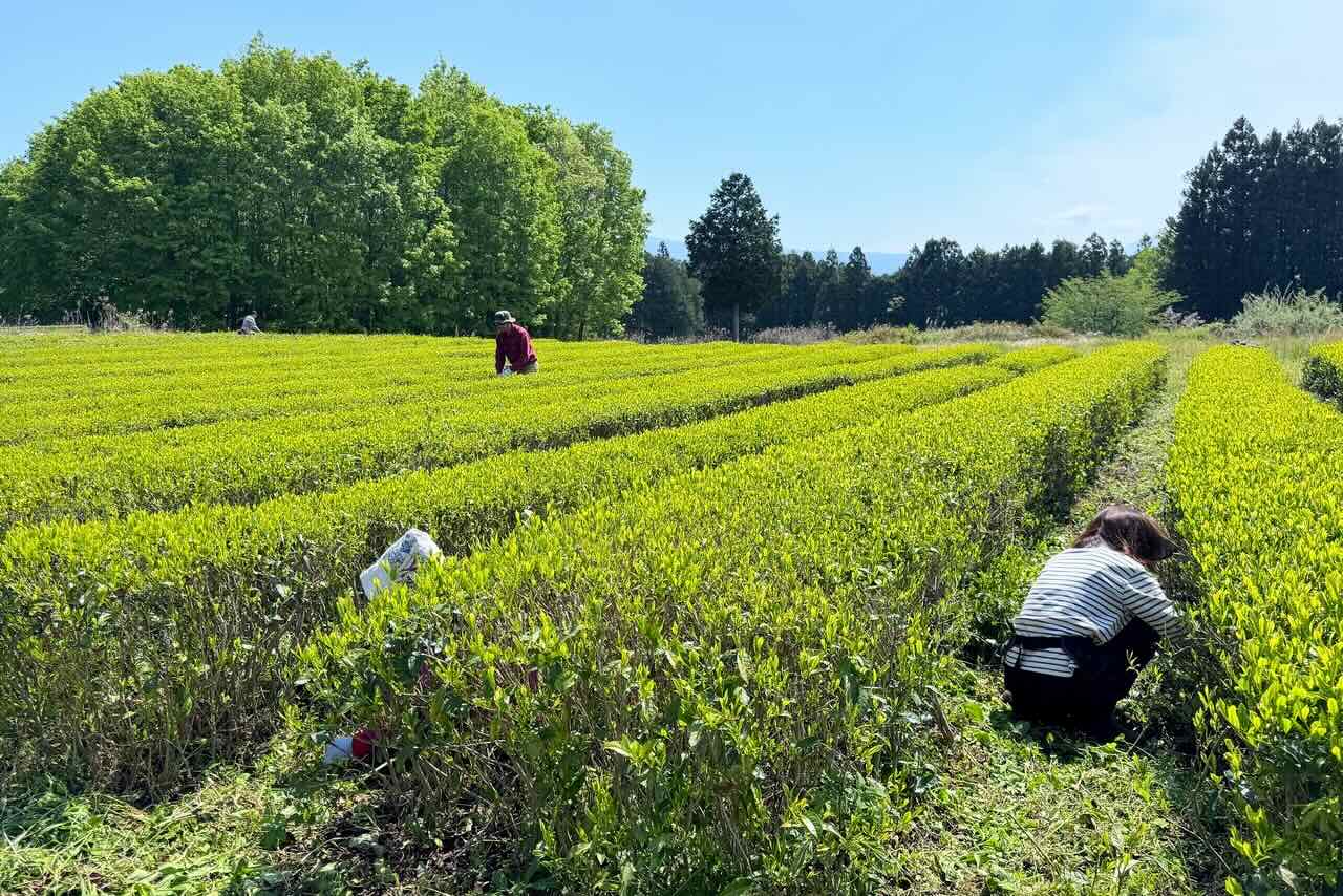 この日は男性3人、女性3人の計6人での作業でした。立っている人は、茶葉の上を手で払うようにして、先日、剪定機で刈った後に茶葉の上に残っている古い葉を下にふり落としています。3時間くらいの作業でしたが、皆んな汗をかきました。