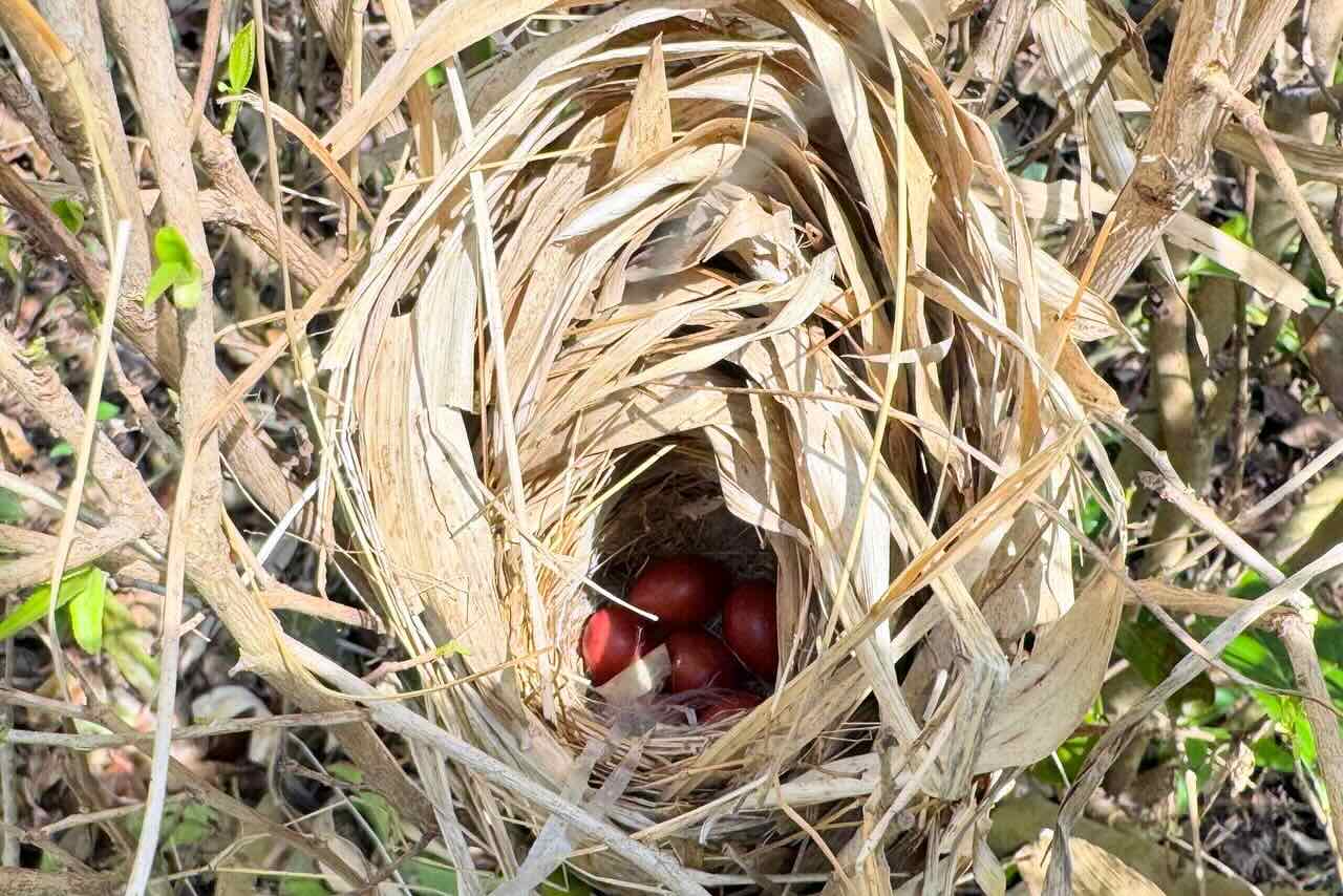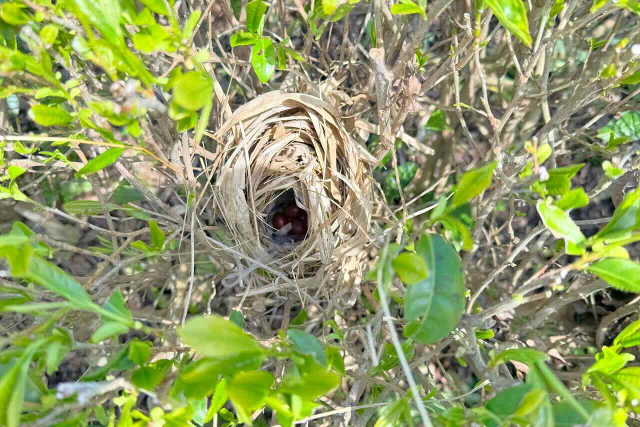 上杉君が、鳥の巣があると教えてくれたので、茶葉をかき分けてそっと覗くと小さな巣があり、小さな赤茶色い卵が6個ありました。ネットで調べるとウグイスの卵だと思います。