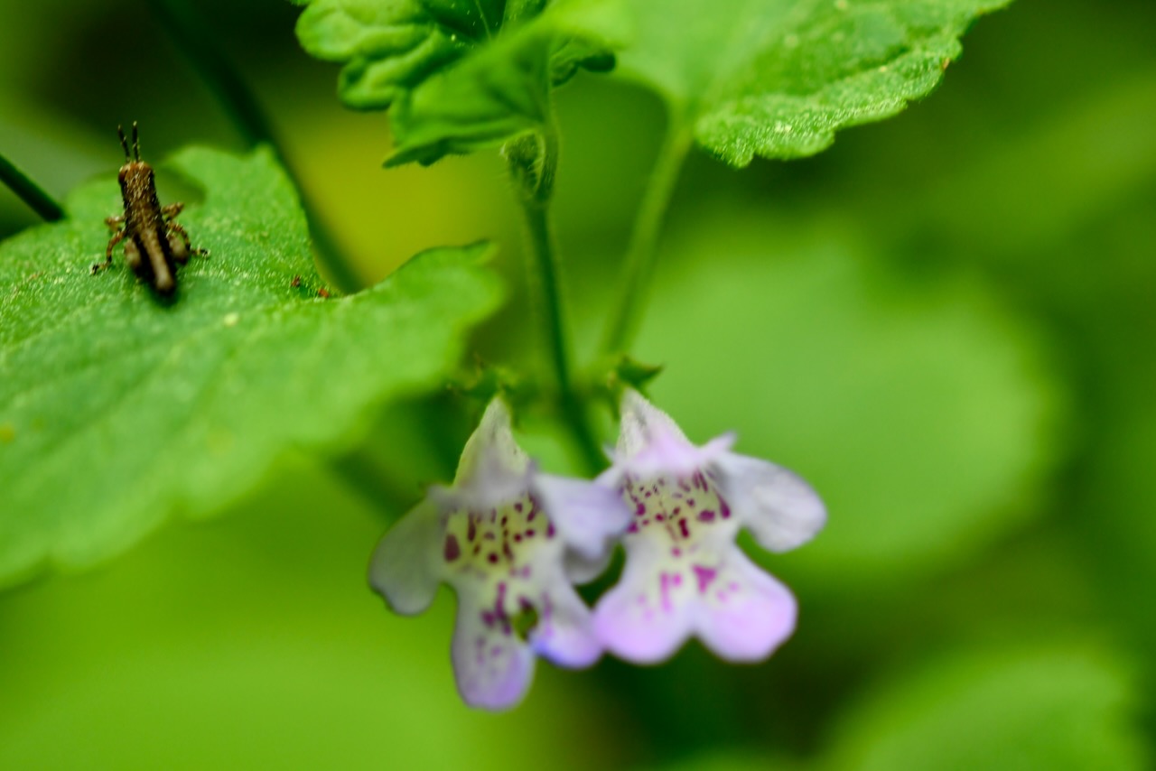 カキドオシの左上に小さなバッタが止まっているのを後から気づきました。