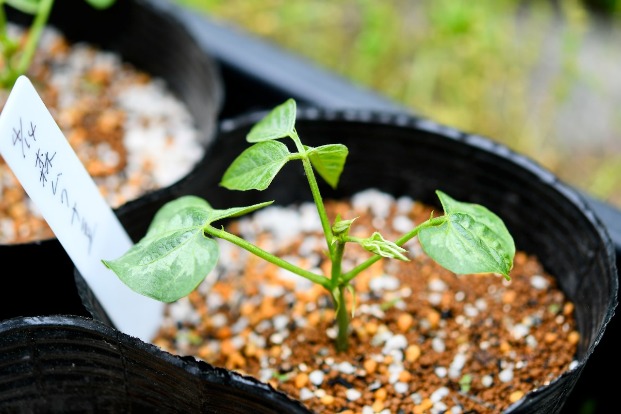 協生農法講師の森さんからいただいた種を何人かで分けて、私は5粒いただきましたが、全部発芽しました。4月11日にポットに種を蒔き夜は小さなビニールケースに入れ育てましたが、私の家は宝山と同じ標高890mあるので、夜は冷えます。1ヶ月経っても芽が出なかったのでもうダメかと思いましたが、なんと1ヶ月過ぎて発芽しました。嬉しかったです。みんなの苗と合わせて、精進川と宝山の2ヶ所に植えます。精進川は暖かいので完熟するまで畑に置いて味噌にしてみたいです。種も繋いでいきます。宝山は寒いので11月末までに収穫しないと霜が降りてカビてしまいます。多分完熟まで待てないので豆が青いうちに収穫することになりそうです。青い豆の活用法を森さんにお聞きしたいと思います。