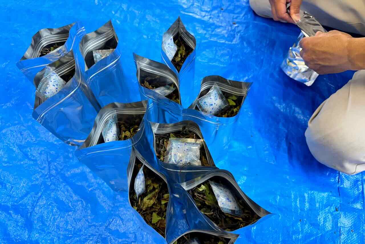 20日はやっと丸一日晴れる日になりました。11日に摘んだ茶葉を、半日でも晴れれば外に出して15日まで干しました。16日から19日までは除湿の効いた部屋で保管していました。そしてこの日8人が集まり茶葉を袋に詰める作業をすることになりました。まず8時から2時間ほど外に出して最後の乾燥をしました。10時から室内に取り込んで袋詰め作業を始めます。