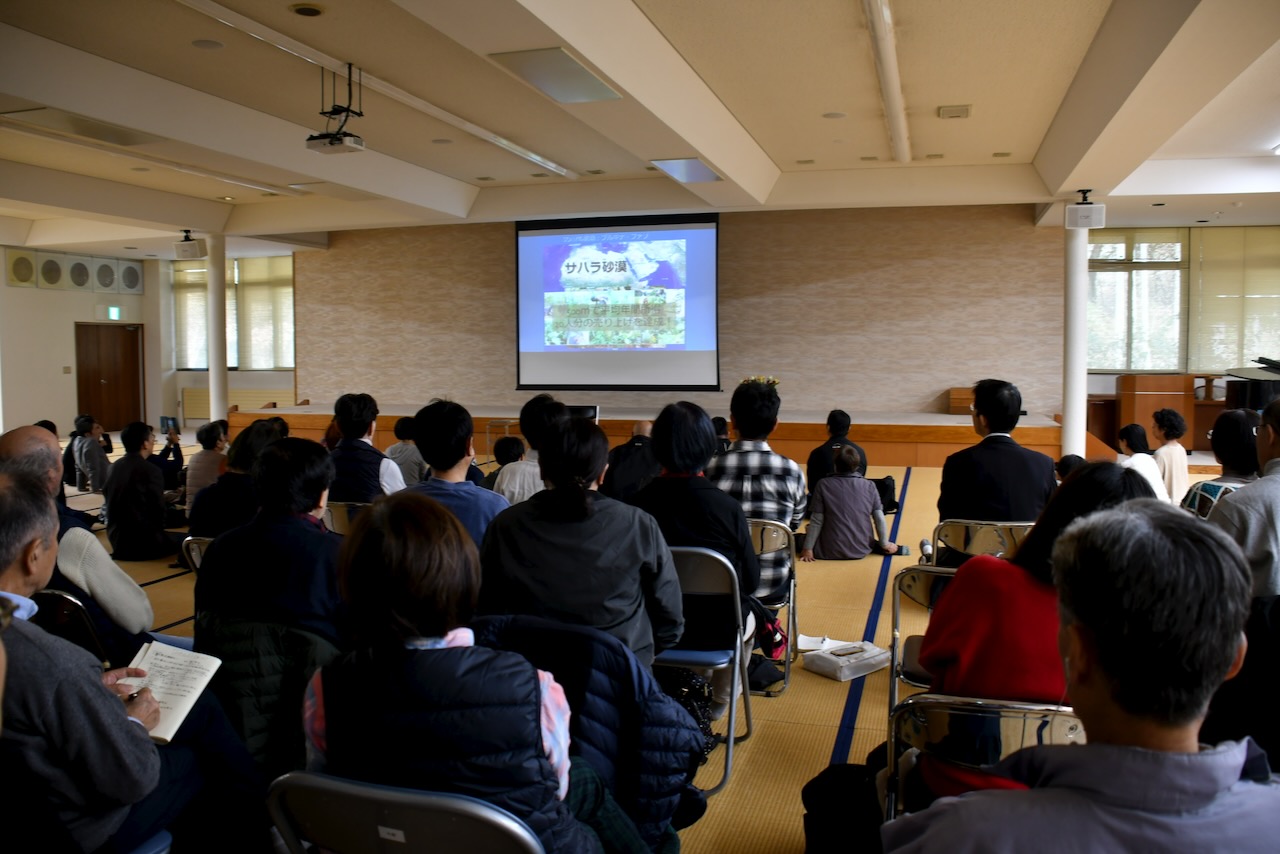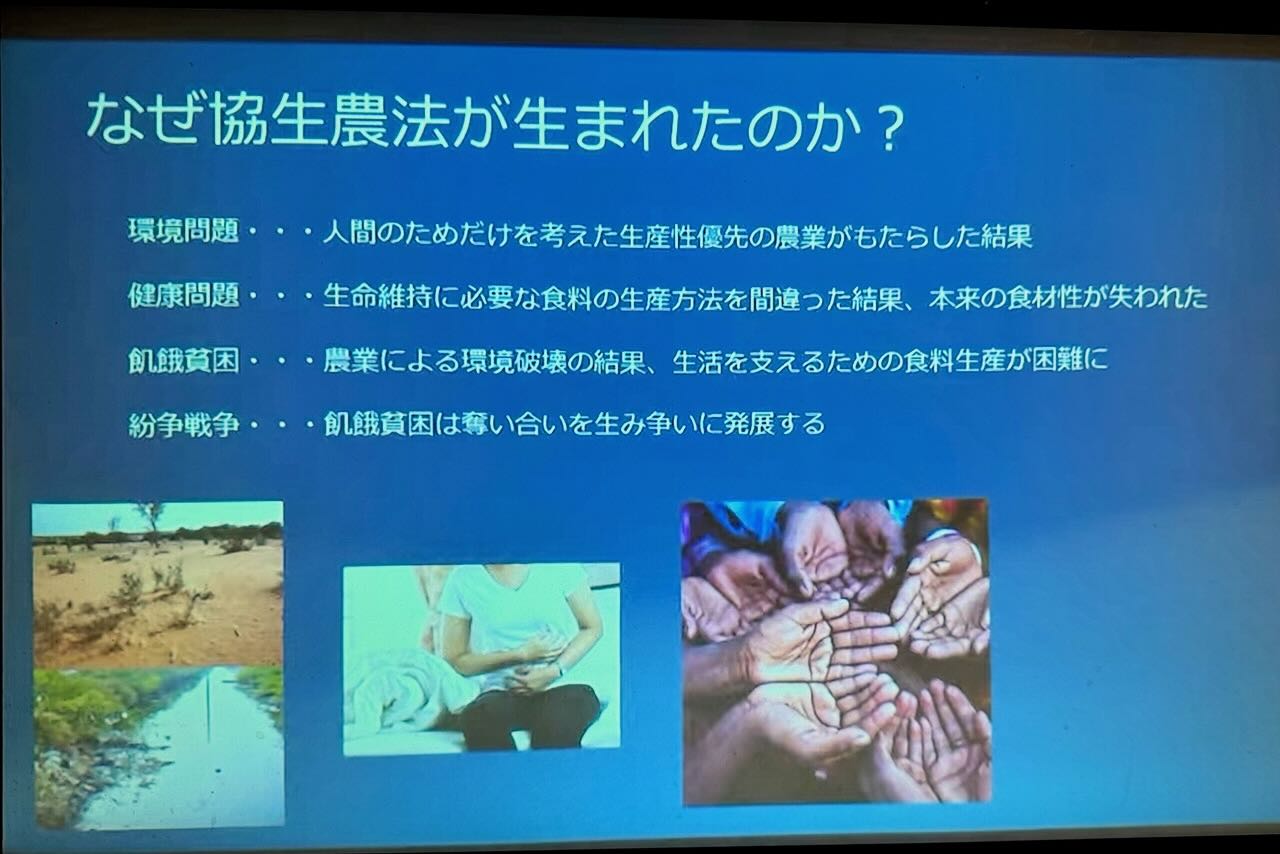 テレビディレクターで科学ジャーナリストである森さんは、具体的にバナメイエビの養殖の現場の写真を見せて、人間の欲で早く大きく育てる為に大量の餌を与え、それが海に流れ汚染していると言う現実を説明し、その間違った考え方やり方が全ての環境汚染に通じている、と言う話から始められました。そこからご自分が2017年から始めた畑がどう変わっていったかの経緯を写真で見せながらお話しされました。クワが壊れるほど堅い土地で、何回も果樹や野菜が枯れて、諦めそうになった日々から、希望が持て始め、やっと確信して仲間を増やしていかれた経過を伝えられました。途中、土づくりをするために雑草をはやしていたら、お父さんに畑作りを諦めたと思われ耕かされてしまった話は皆んなの笑いをとり、和気あいあいとした雰囲気になりました。にこやかに話されていますが、上手くいかずやめようかと思われたことがあると言われ、とても気持ちがわかり共感しました。