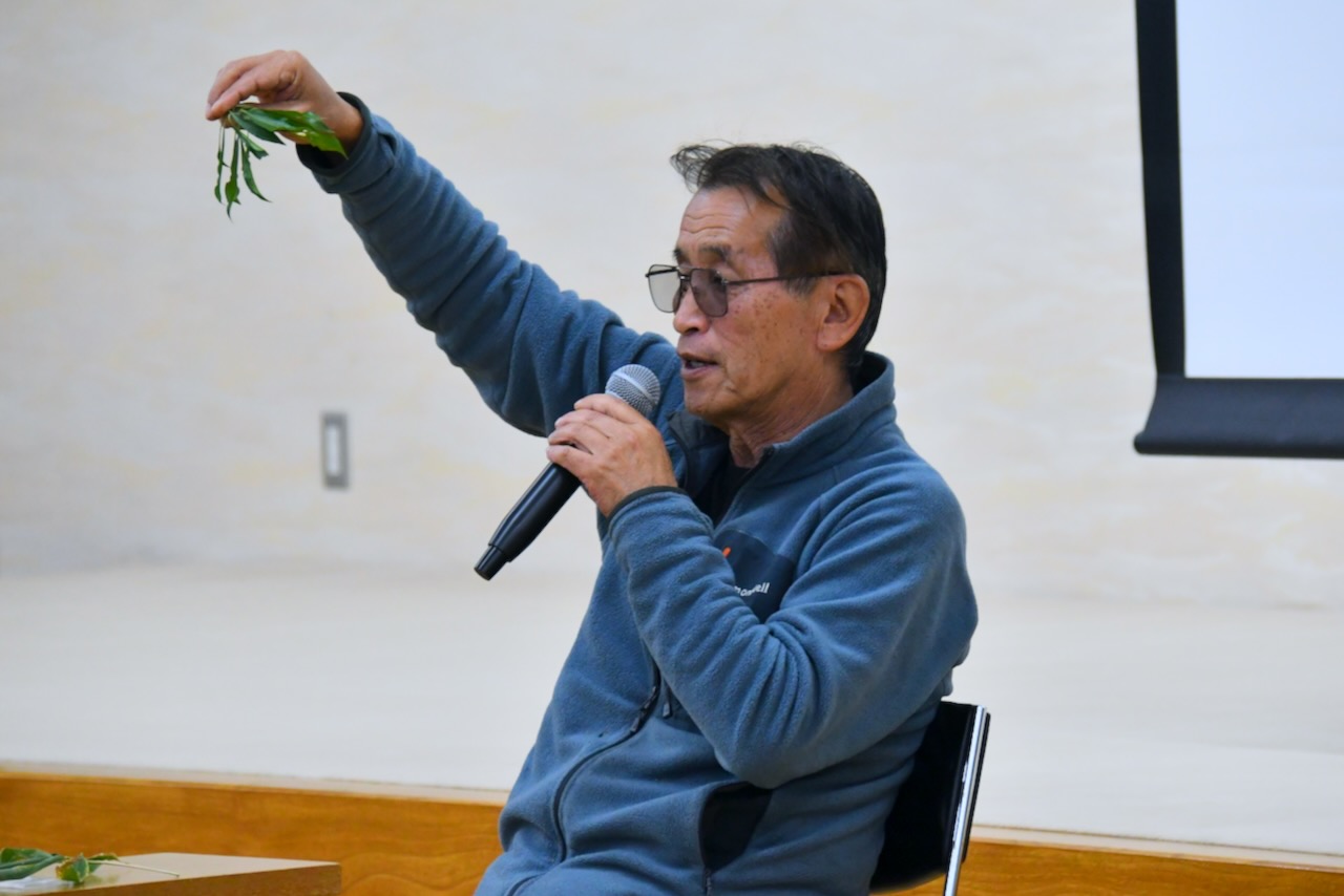 野人さんが持っているのはアセビの葉です。机に置いているのはササの葉です。ササは有用植物でアセビは有毒植物だという話から入り、みなさんどよめきました。すかさず、アセビは食べたら死に至るけれど、毒が回る前にササを食べれば毒は消えます、ここで試しても良いが忙しいからやめると言って笑いをとりました。さすが野人さん必ず笑いはとります。グッと皆さんを惹きつけました。