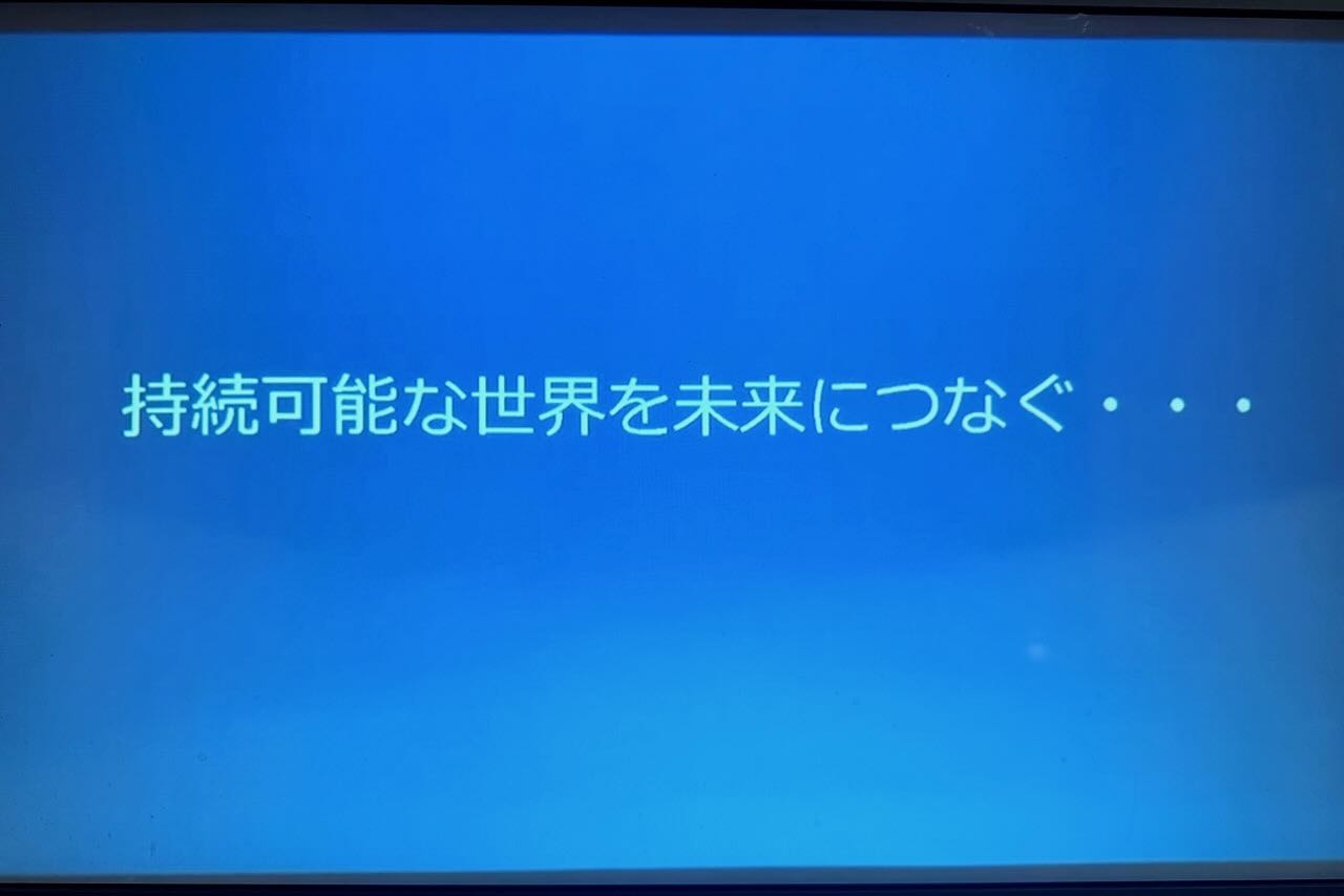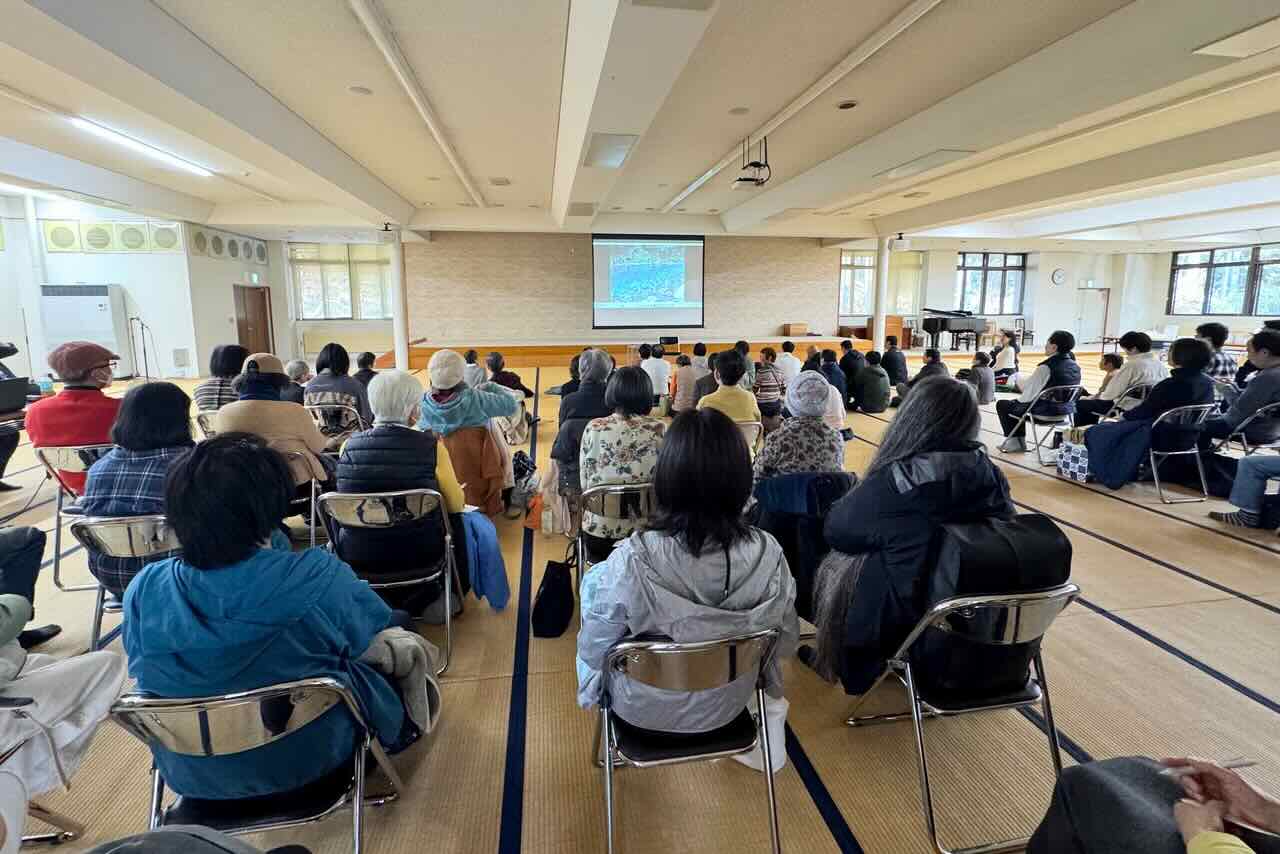 パソコンをプロジェクターに繋ぎ大きなスクリーンに映像を映し出してお話しされます。