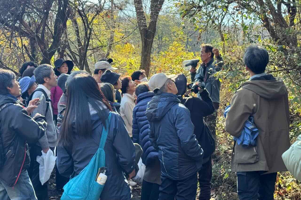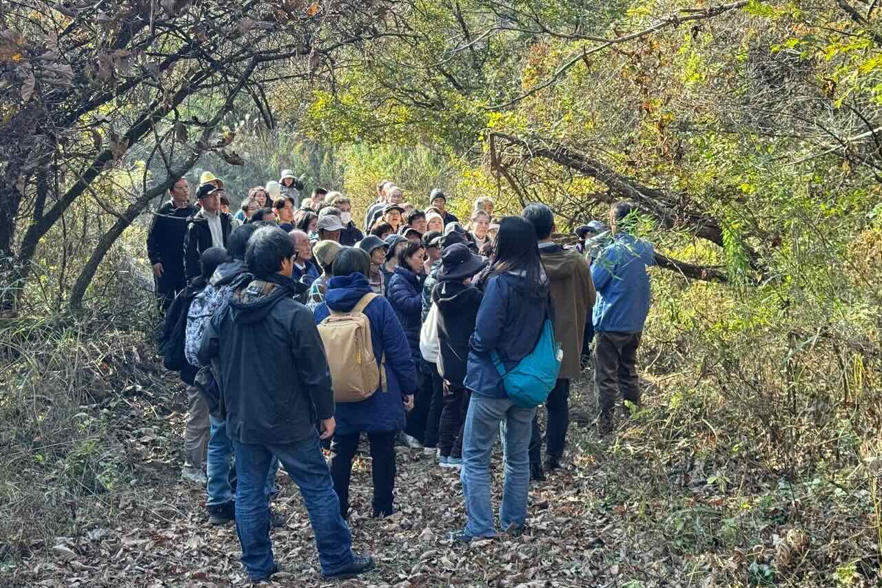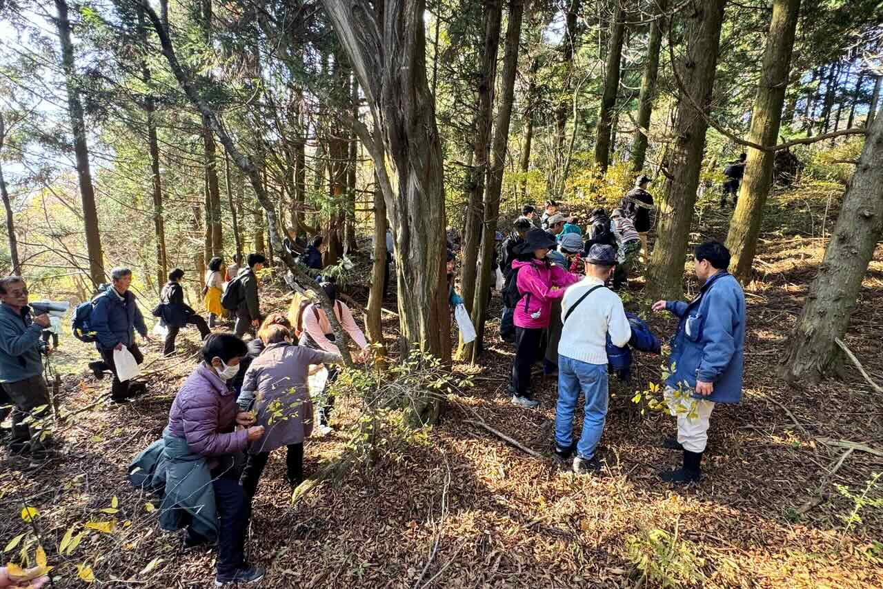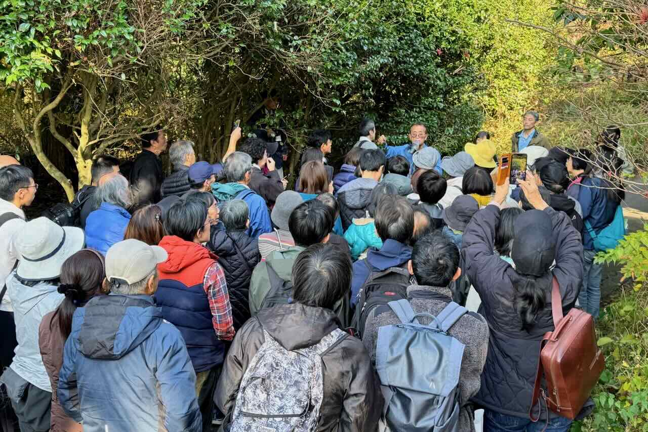 昼食時には、野草茶を配り、協生農法の大根を試食して頂きました。その後、遊歩道に行きましたが、ほとんどの人が参加されました。本館道場を出てすぐの場所です。道が狭いので大混雑です。