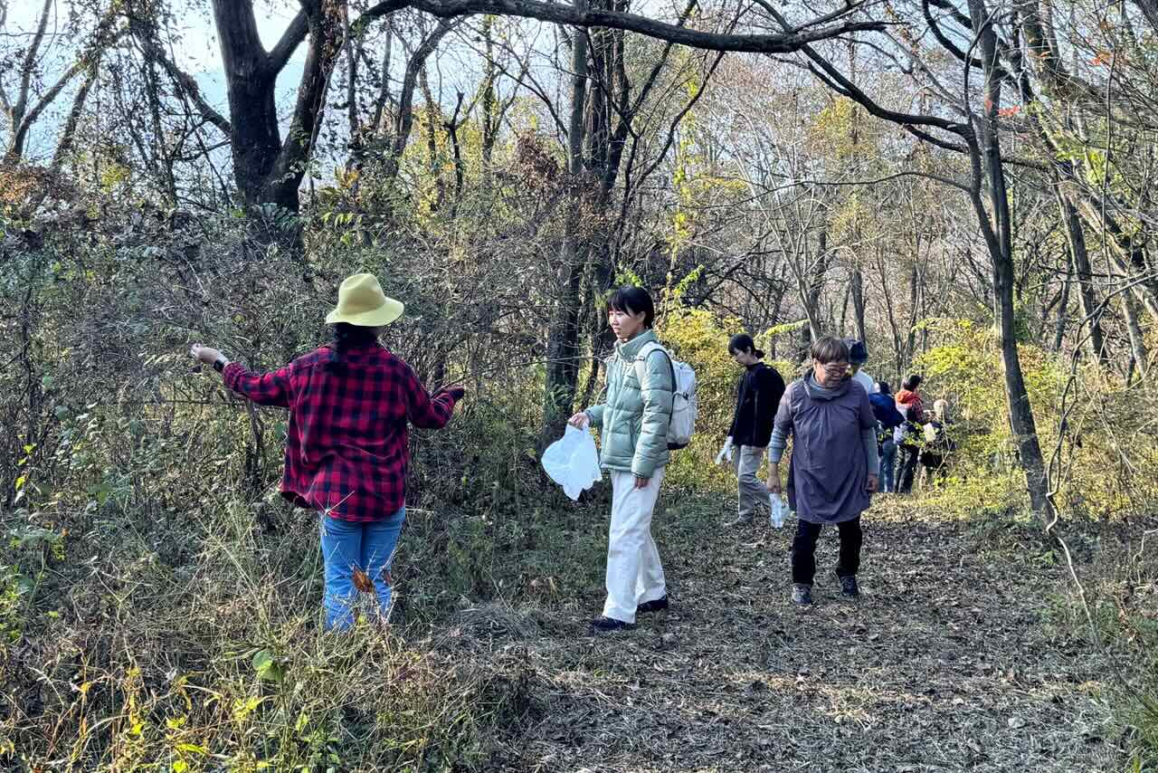 遊歩道を出た場所で、私たちが用意したビワとクワの葉を透明な袋にセットしたものを皆さんに配りました。60個用意したのですが、予備があったのでギリギリ間に合いました。そこでもう歩きたくない人は解散だったのですが、ほとんどの方が続いて農園の方へ行きました。