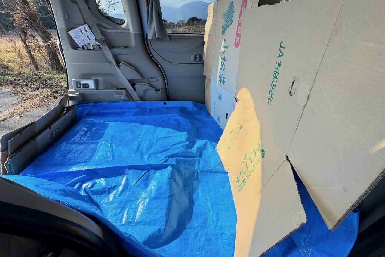 私の車にブルーシートを敷き、周りに段ボールを立てて汚れを防ぎます。