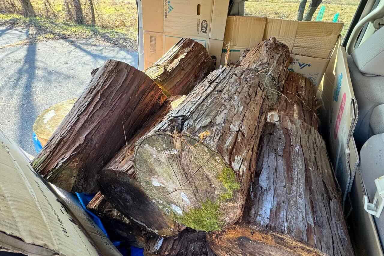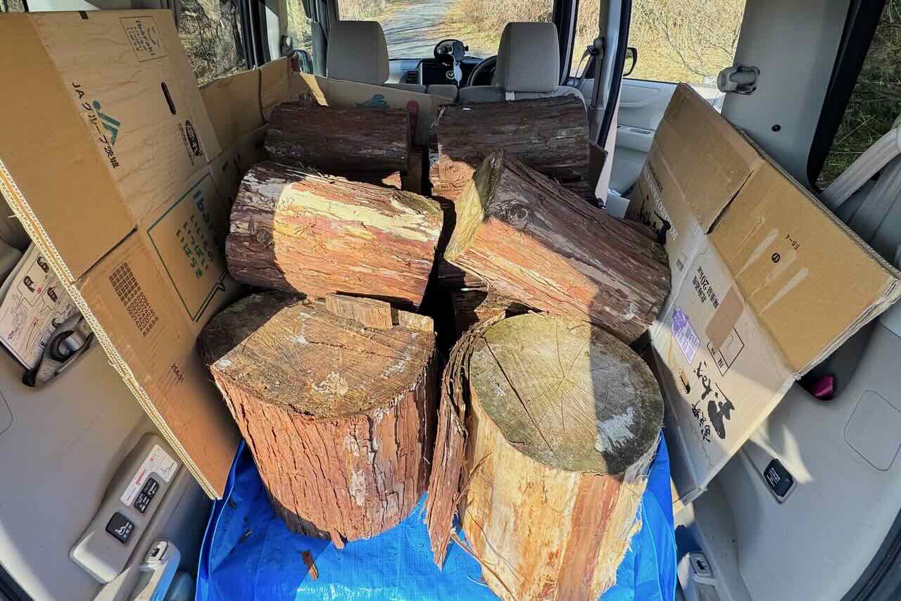 結構重いです。柳田さんが頑張って1人で持ち上げようとしています。重い丸太を車に積む時は、ドアを上にあげた後ろから、丸太を2人で持ち上げてセーノで積みます。