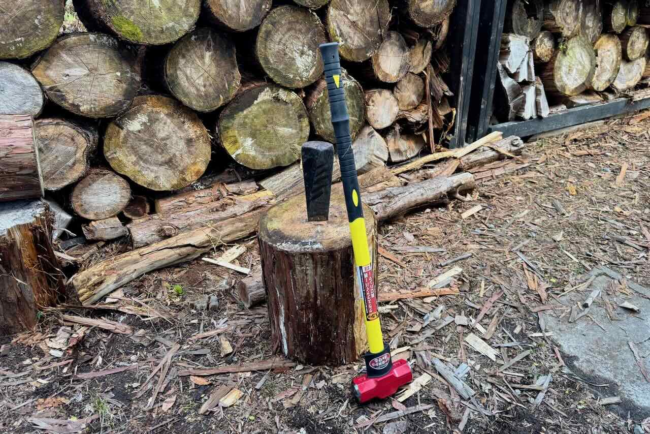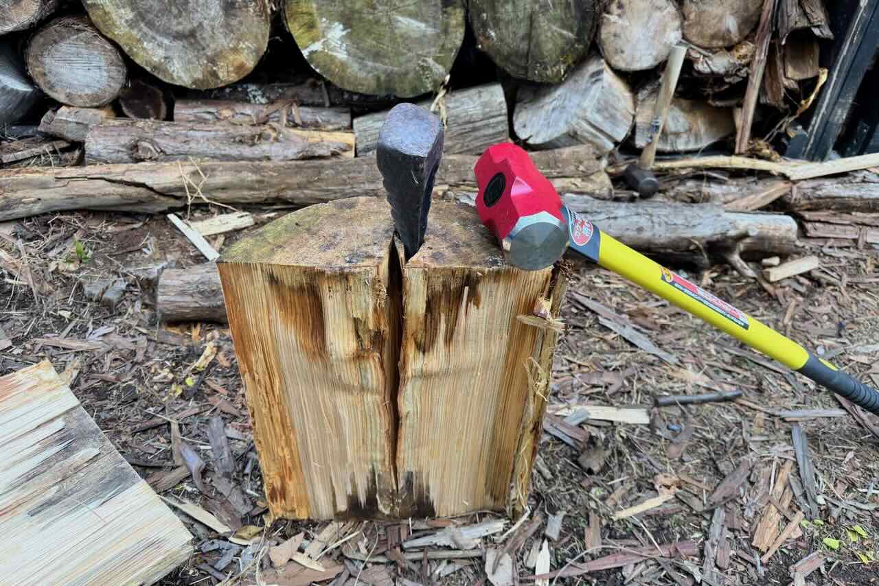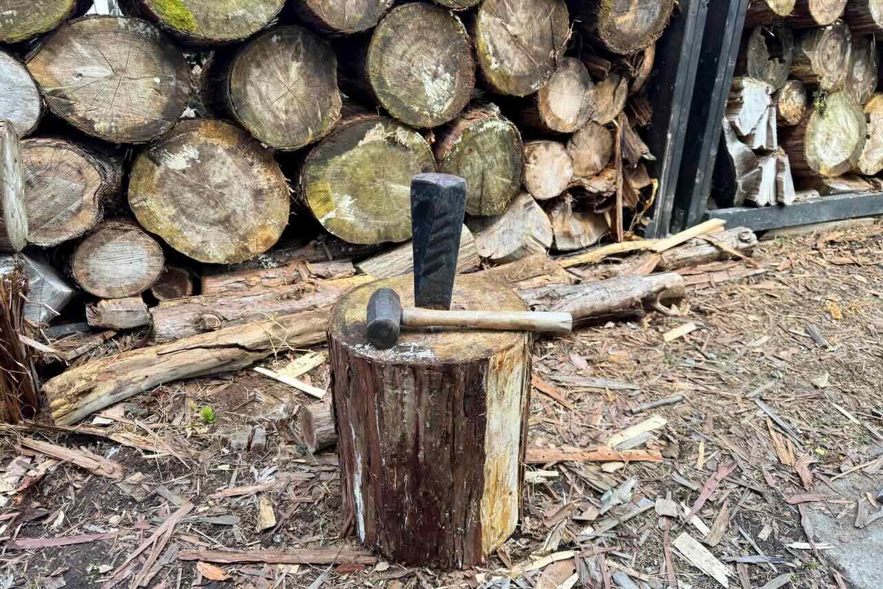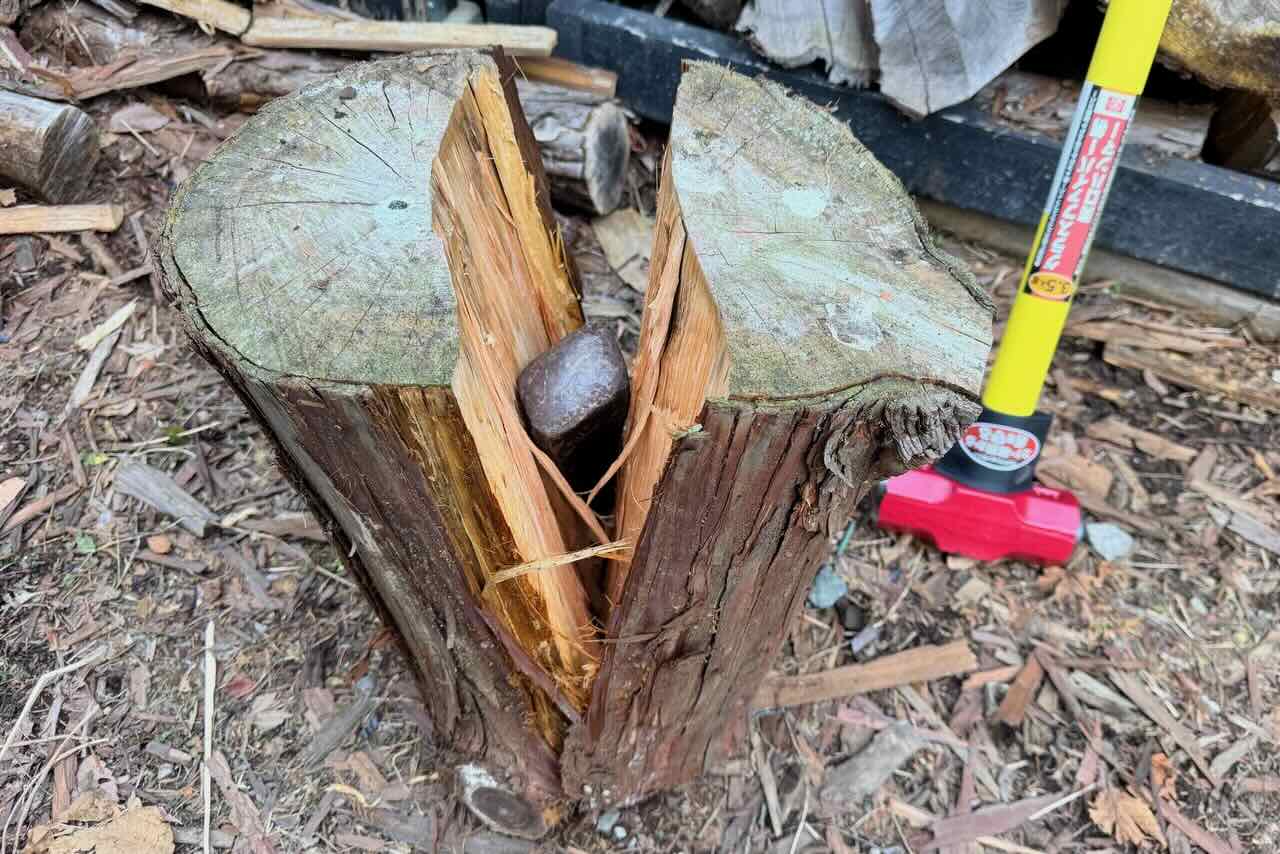 丸太が硬いので、斧🪓では割れません。この鉄の矢(くさび)は2.6kgあります。それを重めの金槌で叩いて食い込ませます。